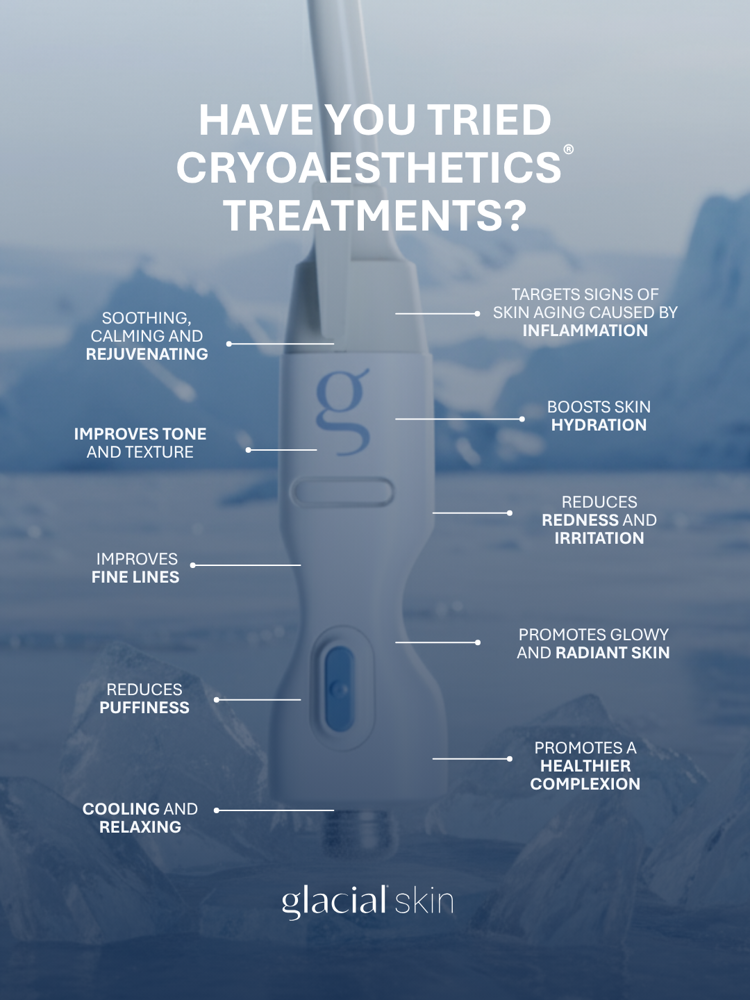 The Glacial® device delivers targeted cold therapy through a smart, handheld applicator. It gently cools the skin while infusing powerful active ingredients—allowing for better absorption, reduced inflammation, and visibly healthier skin. It’s clinically proven to: